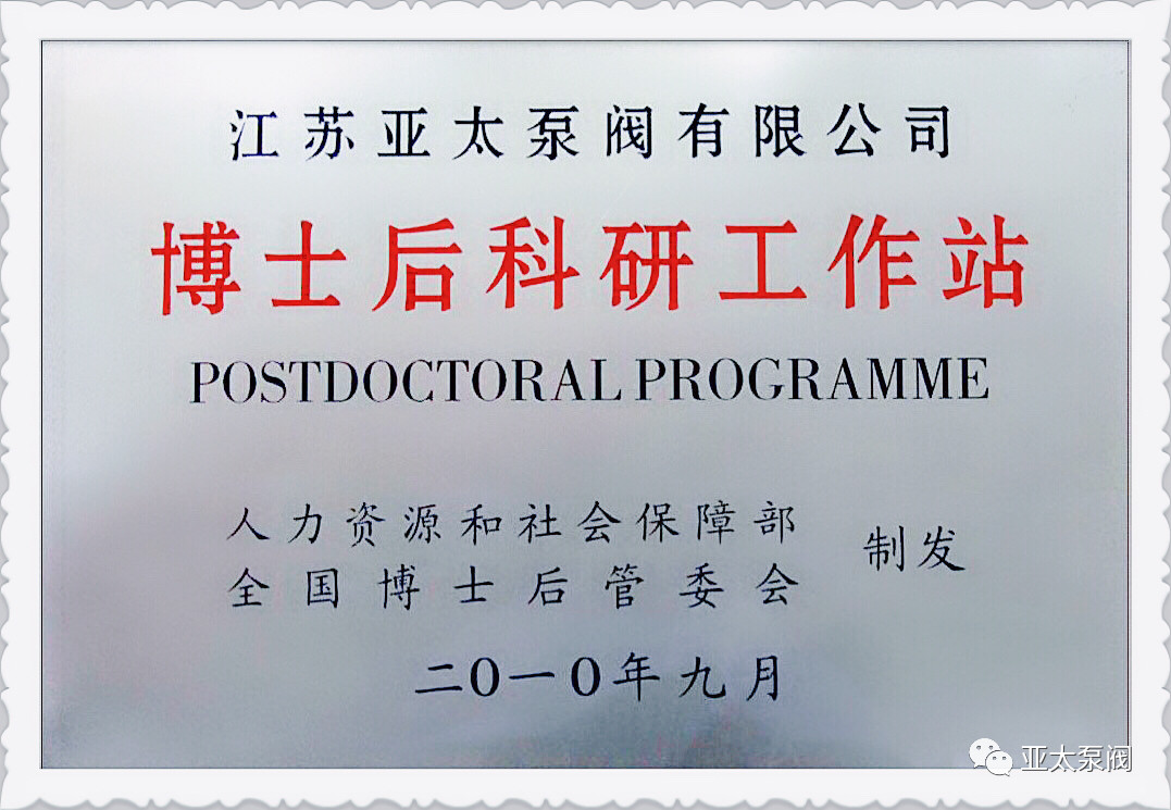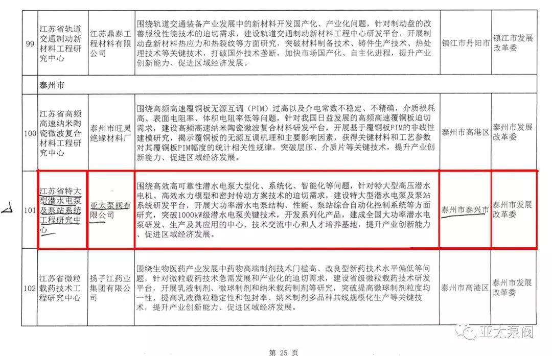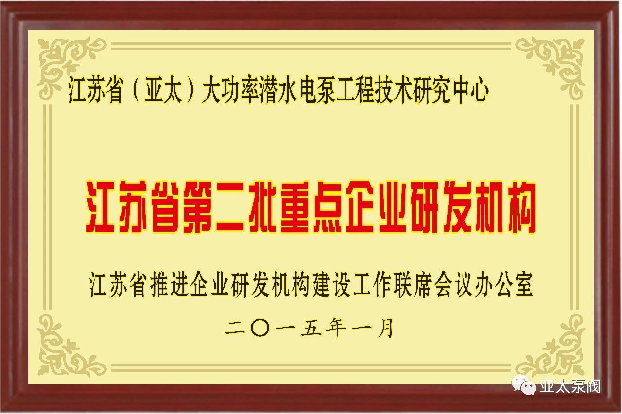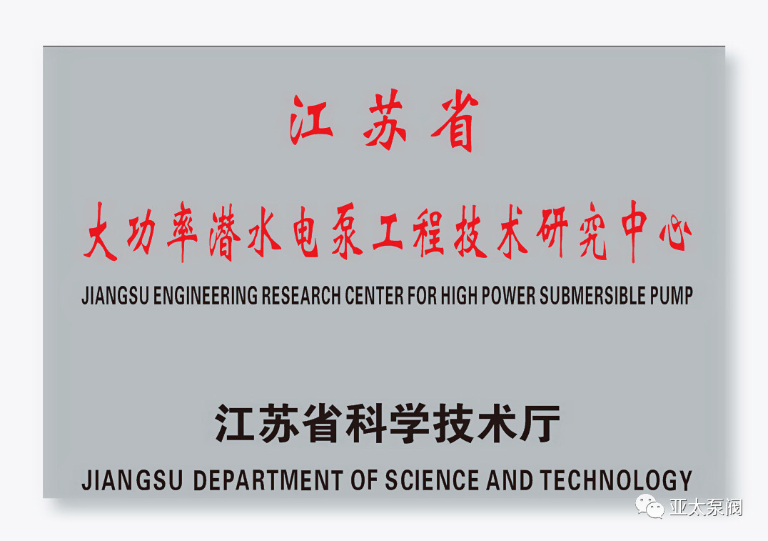 亚太泵阀有限公司是专业从事大功率潜水电泵及泵站系统研究的国家高新技术企业,企业先后获批国家博士后科研工作站、江苏省企业技术中 心、江苏省大功率潜水电泵工程技术研究中心、江苏省研究生工作站等省级平台,技术创新能力显著增强,先后获得国家科技二等奖1项、省部级科技进步奖12项、承担国家和省级研发项目11项、主持和参与制订国家和行业标准8项。此次成功获批省特大型潜水电泵及泵站系统工程研究中心,成为亚太泵阀第5个省级以上研发平台。