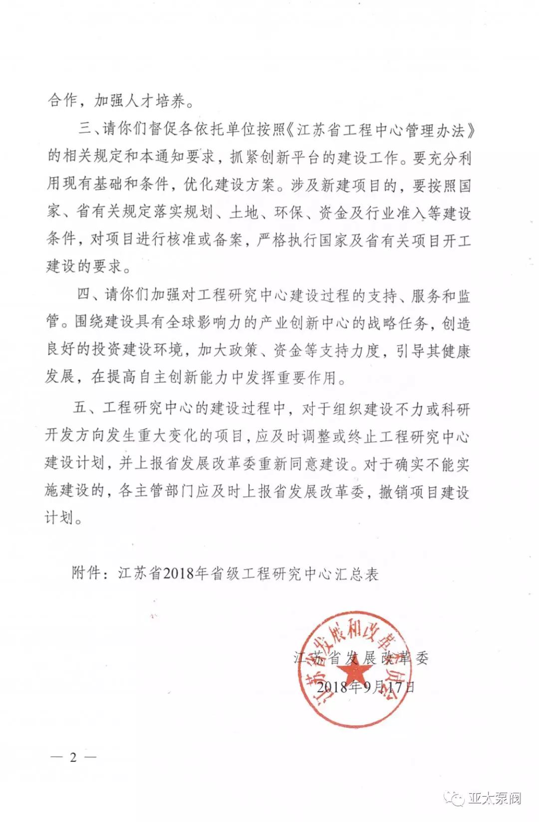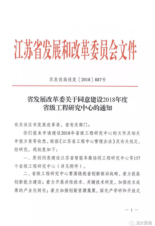 近日,省发改委正式发文,同意建设2018年度省级工程研究中心,亚太泵阀有限公司申报的省级创新平台江苏省特大型潜水电泵及泵站系统工程研究中心成功获批,成为我省水泵行业唯 一入选企业。